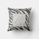 This stylish and luxurious custom pillow features a zebra print background with white and dark gray colored stripes. The center of the pillow has a monogram initial printed in a soft gray colored, elegant font. A sample name is printed in a darker shade of gray over top of the initial. The monogram box is framed with a soft gray border and a matching gray frame borders the edge of the blanket.