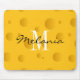 Custom monogram yellow swiss cheese mouse pad. Classy script typography and fun background texture. Cute mousepad design for men women and kids. Monogrammed with your name initial letter. Funny Birthday gift idea for cheese lover, mum, mother, girfriend, husband, wife, daughter, friend, co worker, boss, employee etc. Custom computer accessories with stylish print for him or her. Food theme.