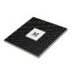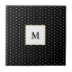 A white polka dot pattern is on a black background. Black monogram is on a white square in the centre. The square has a faux (no foil) gold trim.