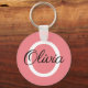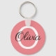 Custom monogrammed coral pink keychain gift. Personalised round button key chain with name initial letter. Elegant script typography template.