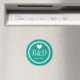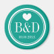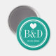 Custom monogrammed wedding party favour magnets. Round shape with heart and personalised monogram name initial letters. Aqua / Aquamarine turquoise blue / sea green and white colours. Cute thank you token giveaway for guests. Includes date of marriage. Also nice as save the date reminder.
