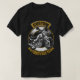 This black t-shirt features a graphic design with a motorcycle club theme. A detailed illustration of a custom motorcycle is prominently displayed within a circular frame outlined in white and gold. A curved gold banner at the top reads "CUSTOM," and the text "MOTORCYCLE CLUB" follows the curve at the bottom in a gold font. The background of the circle is a textured grey. This design represents a community of custom motorcycle enthusiasts.
