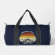 This cool orange vintage sunset over rocky mountains in nature makes a great image on a cute retro navy blue duffel bag for a mountain hiking trip or camping vacation for a family who loves to spend time outdoors and the wilderness.