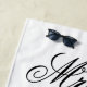 Custom Mr & Mrs beach towel for newly weds couple. Elegant wedding day gift idea for newlyweds and honeymooners. Personalised presents with surname of bride and groom plus date of marriage. Beautiful script typography design. Chic black and white template design for married couples. Create towels for new husband and wife. Create his and hers for him and her. Fun summer accessories for tropical beach destination or pool. White or custom colour.