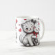Imagine a white, delicate mug with a smooth and glossy surface. Around it, there's a charming design of cute kittens, all with adorable expressions, big, bright eyes. Some kittens are playfully chasing colorful yarn balls, while others are lying down, striking a "cute" pose with their little paws. The cats are drawn in soft shades of gray, white, and beige, with small pink details on their ears and noses, creating a subtle and endearing contrast. The background of the mug features tiny cat paw prints and hearts scattered around. This mug evokes a cozy, affectionate feeling, perfect for anyone who loves cats and wants a cute, warm touch for their coffee or tea moments.