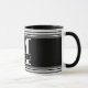 A Modern Custom mum Personalised Monogram Black & White Coffee Mug. Completely Customise and personalise the monogram and word on cup. Black background and white lettering with white horizontal stripes on the top and bottom