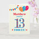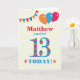 A colorful birthday card for a 13-year-old for you to customize with a name, The large number 13 is filled with an orange, red and blue pattern, outlined in bright blue. There are balloons and bunting at the top, in matching colors and the front cover greeting is, '(Name here), you're 13 today!' in bright red and blue lettering, on a very pale yellow and white polka dot background, with red and orange stars each side of the word 'TODAY!'. The inside message can easily be customized or deleted if you wish.