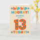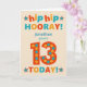 A bright and cheerful birthday card for you to personalize on the front cover, with colorful lettering on a cream background. The front cover greeting is, 'hip hip HOORAY! (Space for you to add the name), you're 13 years old TODAY!' in a bold, colorful script. The red number 13 is extra-large and has big dots in golden yellow and a greenish blue. The inside message is just a suggestion and you can easily change it or delete it if you prefer something different or no printed inside message at all.