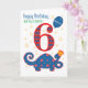 A fun 6th birthday card to customize, with a cute dinosaur, wearing a party hat and with a balloon tied to its tail. The dinosaur (diplodocus) has pink, yellow and orange polka dots and the number 6 is filled with brightly colored stripes. The front cover greeting, in blue to match the dinosaur, is, 'Happy Birthday' with space for you to add the name of the child's birthday. The balloon is also blue and has the word, 'TODAY!' written on it in white and there are little yellow stars all over the white background. The inside message is just a suggestion and you can easily personalize it if you wish.