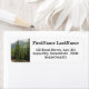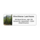 This return address label design features a photo of a forest scene with coniferous trees, along with a mountain in the background. It also features a custom person, family or business name, above a custom mailing address.