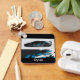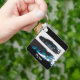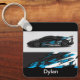 This keychain is shown in a black colour with a auto race car print design with a custom sample name.