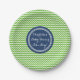 Customisable name it's a boy baby shower party plates in fun and chic dark navy blue, bright lime green and white retro chevron zigzag stripes pattern.