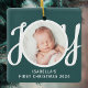 This cute Baby's First Christmas Photo Ornament is decorated with the word JOY in stylish script typography on a green background.