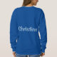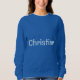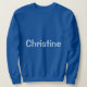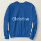 The royal blue sweatshirt is customised with a woman's name, Christine. The name is a Chambray Comfort Colour light blue colour. The name Christine is on the front and back of the sweatshirt. You can replace the name by clicking the Personalise link. The sweatshirt fits true to size. The sweatshirt is a cotton polyester blend. The sweatshirt has set-in sleeves and double-needle stitched neckline, armholes and bottom band for long-term durability. The fabric is imported. The fabric care instructions are machine wash cold and tumble dry low.