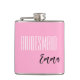 Flask for the bridesmaid is shown in pink with black and white text and has a sample name.