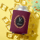 Custom name can cooler is shown with a winner's gold wreath print with a sample initial and name.