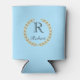 Custom name can cooler is shown with a winner's gold wreath print with a sample initial and name.
