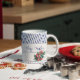 Merry Christmas mug in modern calligraphy with candy cane & winter greenery and blue striped background.
