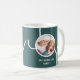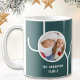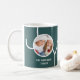 This stylish keepsake Christmas Holiday mug is decorated with the word JOY on a green background.