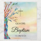 This colourful Baptism Wine Label features a family tree in the colours of the rainbow and a cross on a watercolor background.