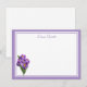 Custom Name Flat Note Card is shown in white with a purple double border trim and a lovely purple crocus flowers print.