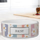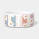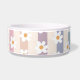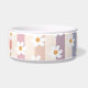 This floral pet bowl is decorated with a pattern of white daisies on a pastel striped background.