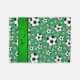 Modern and trendy Custom name sports random black and white soccer balls pattern green background and with green stripe personalised with just add your name gifts or monogram gifts or your initials for a unique gift. Sports gift ideas for men and boys and girls. Ideal for birthdays.