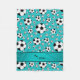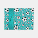 Modern and trendy Custom name sports random black and white soccer balls pattern turquoise background and with turquoise stripe personalised with just add your name gifts or monogram gifts or your initials for a unique gift. Sports gift ideas for men and boys and girls.