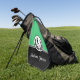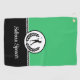 This golf towel is shown as is in a two-tone colour of black and green with a white accent stripe and shows an art print of a golfer.