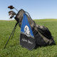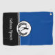 This golf towel is shown as is in a two-tone colour of black and royal blue with a white accent stripe and shows an art print of a golfer.