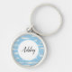 This keychain is shown in a blue and white paint brush strokes print design with a sample name.