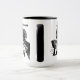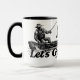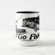 Let's go fishing old-style illustration mug with a big trout and a fish angler on a boat. Personalise it with a name for an ideal gift for a man who loves outdoor sports.