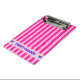 This mini clipboard design features a pattern of alternating light pink and deep pink stripes. It also features a customised name between two heart shapes in purple-coloured text, within a hazy light grey coloured area. [~Z0000237]