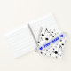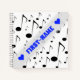 This notebook design features a pattern of various sized music notes. It might be appreciated by a musician, a composer, a singer, or somebody else who really likes music. The front also features a customised name between two heart shapes in blue-coloured text, within a hazy light grey coloured area, at an angle. A notebook like this might make a great personalised gift for a student, or perhaps a fun gift for somebody who likes to write stories or poetry. [~Z0000201]