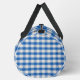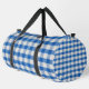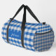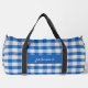 This unique duffel bag design is whimsical and stylish. The background consists of an abstract a classic blue background. The front features your custom name or short text in stylish white script on a matching blue band. All colours in this design can be customised and you may further personalise the bag with your choice of font type in the design tool area.