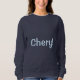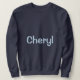 This is a Navy Blue Women's Basic Sweatshirt. The navy blue sweatshirt is customized with a woman's name, Cheryl. The name is a Chambray Comfort Color light blue color. The name Cheryl is on the front and back of the sweatshirt. You can replace the name by clicking the Personalize link. The sweatshirt fits true to size. The sweatshirt is a cotton polyester blend. The sweatshirt has set-in sleeves and double-needle stitched neckline, armholes and bottom band for long-term durability. The fabric is imported. The fabric care instructions are machine wash cold and tumble dry low.