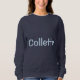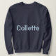 The navy blue sweatshirt is customised with a woman's name, Collette. The name is a Chambray Comfort Colour light blue colour. The name Collette is on the front and back of the sweatshirt. You can replace the name by clicking the Personalise link. The sweatshirt fits true to size. The sweatshirt is a cotton polyester blend. The sweatshirt has set-in sleeves and double-needle stitched neckline, armholes and bottom band for long-term durability. The fabric is imported. The fabric care instructions are machine wash cold and tumble dry low.