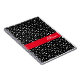Notebook shown with a cute black and white polka dots print and a red colour accent strip with a custom name sample.