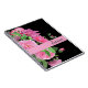 Notebook shown with a black background colour with a lovely pink roses graphic print and a name sample.