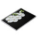 Notebook shown with a black background colour with a pretty white orchids graphic print.