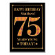 A chic 75th birthday card for you to customise with the name of relationship of the recipient. The numbers, 75, are filled with a yellow, orange and red tartan pattern and outlined in gold-effect. The front cover message is, 'HAPPY BIRTHDAY, followed by a space for your customisation, 75 years young today', in gold-effect lettering on a black background. There are gold-effect stars each side of 'TODAY!' and at the corners of the slim gold-effect border. Please feel free to personalise the inside message or delete it if you wish.