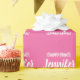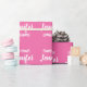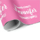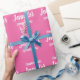 Custom name wrapping paper with decorative swashes. White text on pink background.