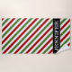 This beach towel design features a pattern of red, white and green stripes. These are colours commonly associated with Christmas. It also features a personalised name in white coloured text within a dark coloured area on the front. [~Z0000000]