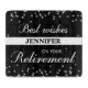 3D looking silver sparkles and words in white, all on a black background. A great Custom Name gift, souvenir, giveaway and party essential to congratulate a man or a woman on their Retirement. A very elegant Congratulations item that you can easily customise.