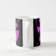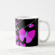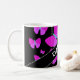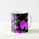 This mug design features a swarm of artistic butterfly representations. The wings of the butterflies feature a line pattern coloured various shades of colours like magenta and purple, while the body is coloured shades of aquamarine. It also features a custom name in white coloured text within a dark coloured area, with both at an angle. [~Z0000051]