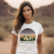 Customise your own family road trip women's t-shirts to embark on a journey through nature this summer or fall. Personalise with your last name underneath the green forest of trees and dark mountain sunset for a cool vacation keepsake for your outdoor group.