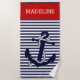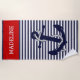 Enjoy total comfort at the beach or sitting poolside, and cool and dry off with this fun, colourful and comfy beach towel. Stand out in the sand with this beautiful contemporary ship anchor, on a classic and chic dark navy blue and white stripes pattern. With room to personalise or customise with name, initials or monogram of your choice, or any kind of nautical expression like "Ship Ahoy", "Sail Away", "Anchors Aweigh", or "Bon Voyage", on a red coloured background. Created for the captain, lover of boating, sailing, vacation and bright sunny summer days on the water or beach.