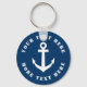 Custom nautical anchor keychain for boat captain. Navy blue and white ship anchor design. Round button key chain for sailor, skipper, captain, first mate etc. Cute gift idea for men and women who love sailing or boating. Add your own surname, boat name, thank you message etc. Also nice as party favor for guests at beach destination wedding.