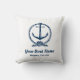 Nautical square throw pillow features a simple, stylish white with navy blue coastal style design with boat anchor and rope knot image. Personalise the custom text with the name of your boat along with her location city and state. Two-sided pillow is available in indoor and outdoor pillow fabrics. Makes a great gift for a new boat owner!