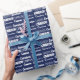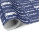 Cool navy blue name collage wrapping paper for a boy's birthday or Christmas decorated in nine different fonts spelling your name in white. Cute custom kids gift wrap with fun typography in white.